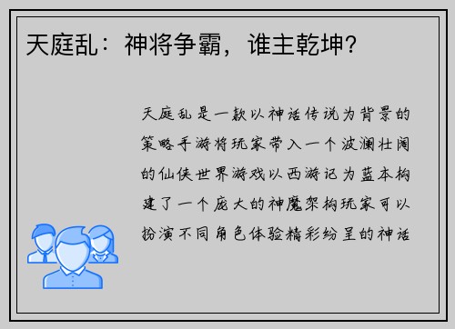 《天庭乱》是一款以神话传说为背景的策略手游,将玩家带入一个波澜壮阔的仙侠世界。游戏以西游记为蓝本,构建了一个庞大的神魔架构,玩家可以扮演不同角色,体验精彩纷呈的神话对决。